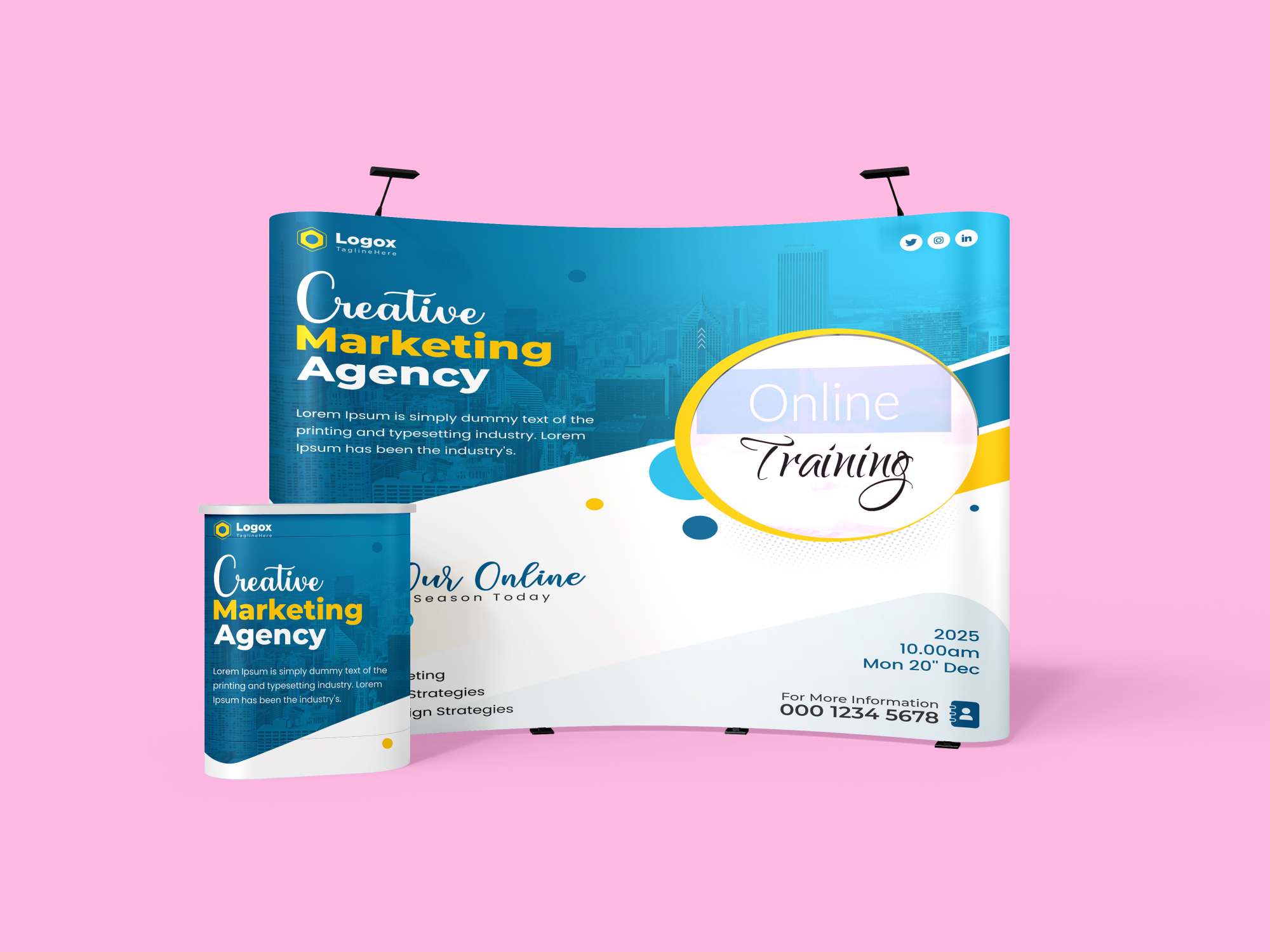 Available in standard pop-up banner sizes for exhibition stands and event spaces